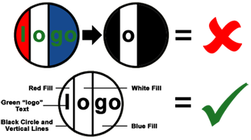 Logo注册文件仅以黑白形式提供。彩色或灰色的logo图形将被拒绝。你必须以PDF形式提供配有对logo设计各个元素进行说明的黑白logo。错误的格式和正确的格式如下:
